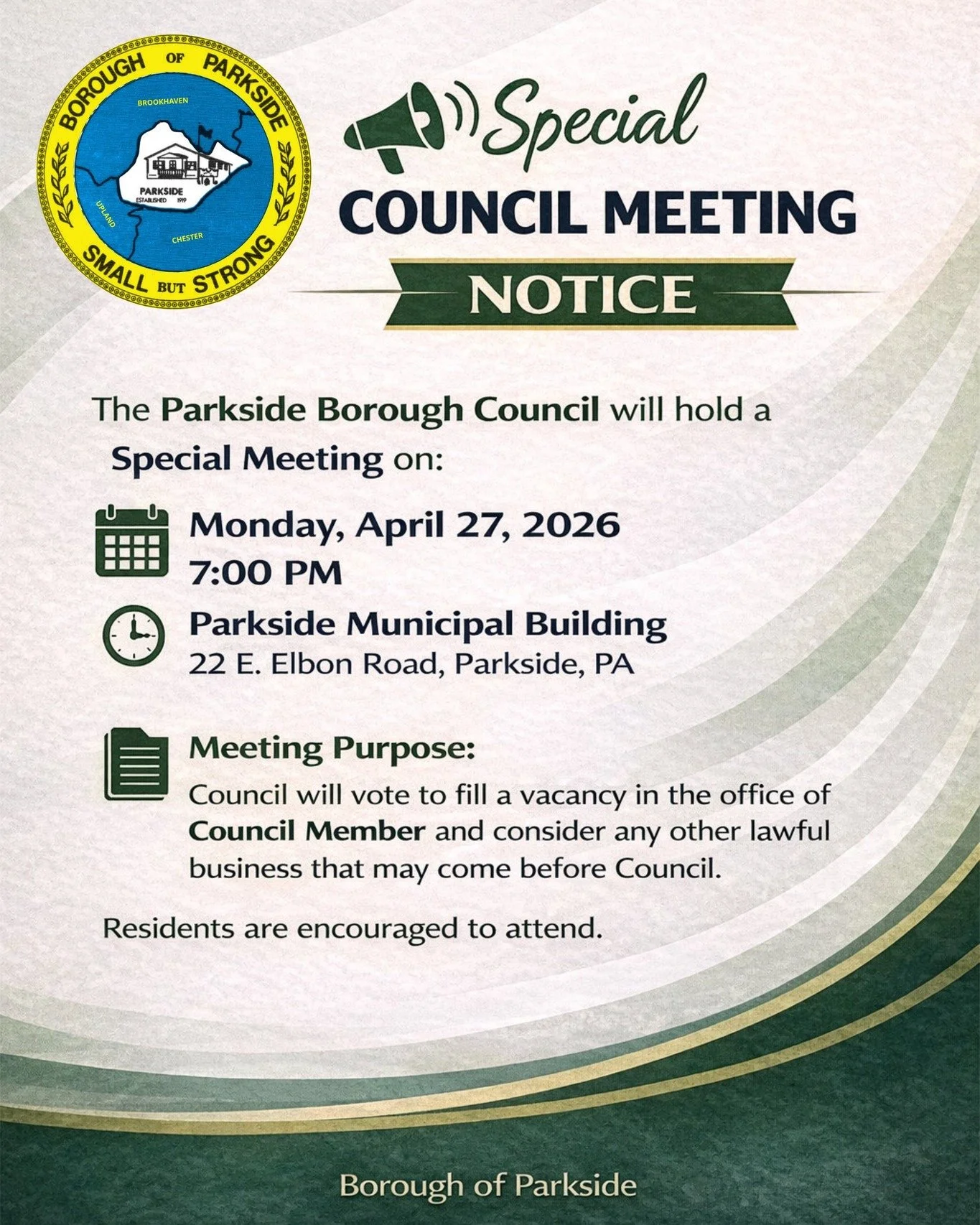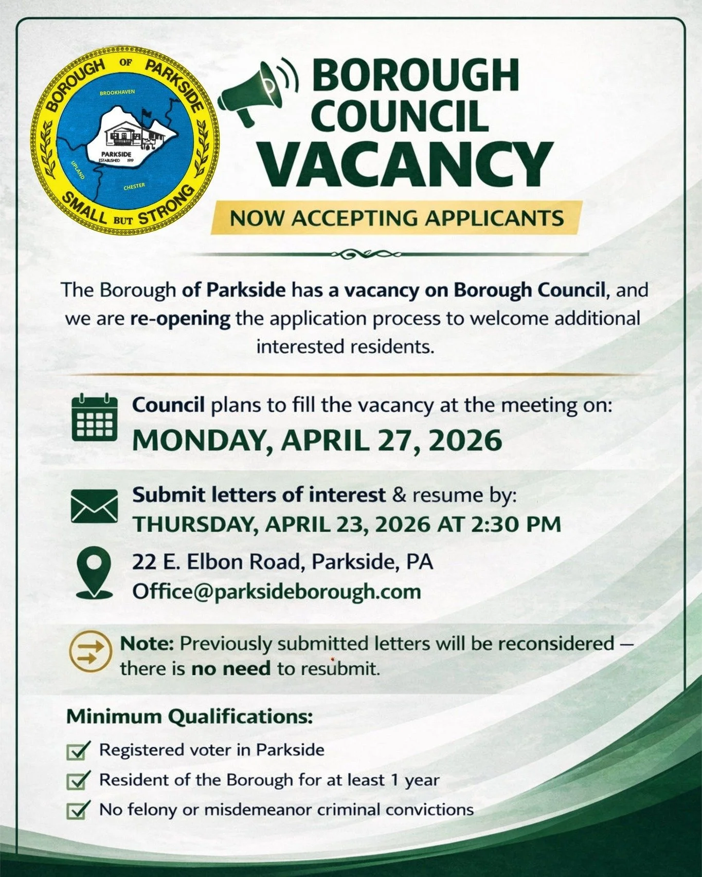 The Borough of Parkside has a vacancy on Borough Council and is seeking qualified residents to fill the position.